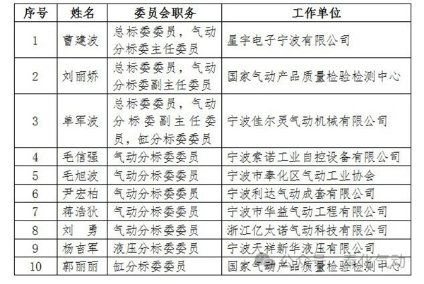 其中星宇電子董事長(zhǎng)曹建波被聘為氣動(dòng)分標(biāo)委主任委員,佳爾靈氣動(dòng)副總經(jīng)理單軍波和國(guó)家氣動(dòng)檢測(cè)中心主任劉麗嬌2人為副主任委員。