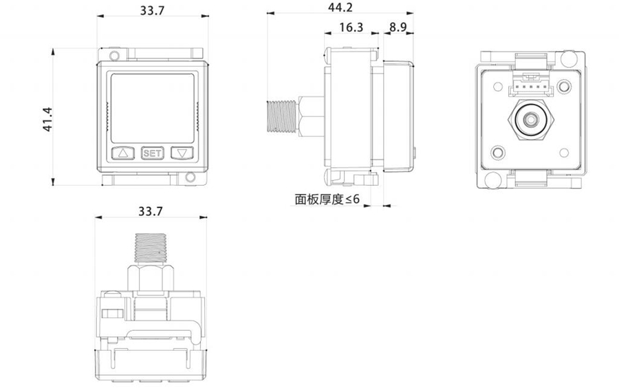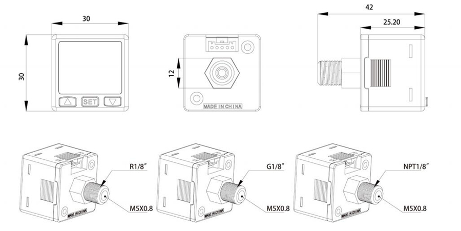 | 壓力接口 | 外螺紋R1/8、G1/8、NPT1/8,內(nèi)螺紋M5 | ||