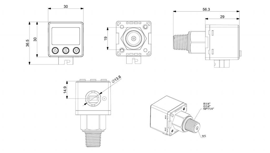 | 壓力接口 | 外螺紋R1/4、NPT1/4、G1/4可選,內(nèi)螺紋M5 | |||